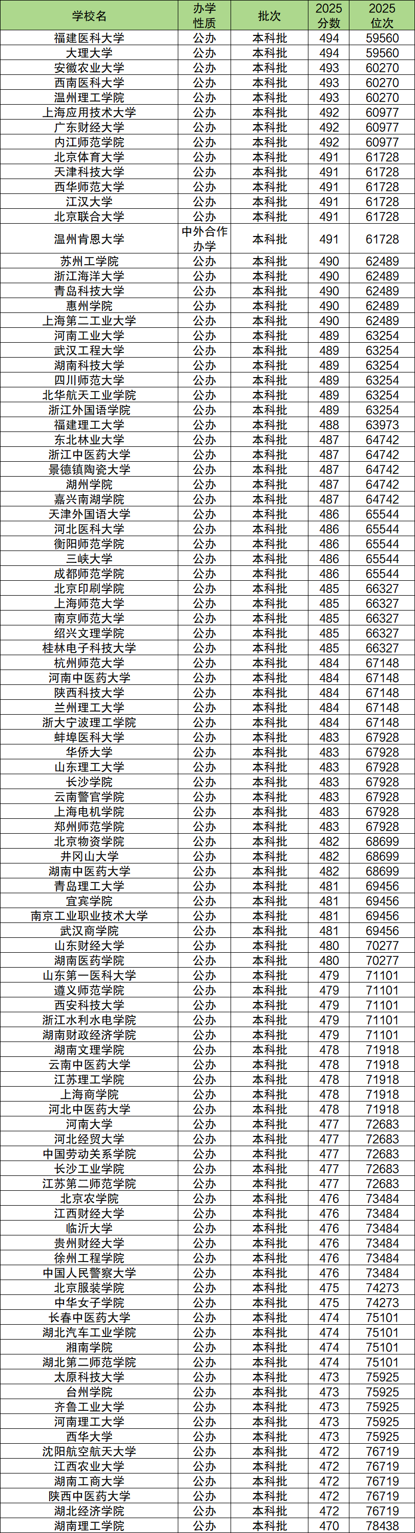 本科線上錄取分數(shù)線最高的是福建醫(yī)科大學(xué)、大理大學(xué)、上海應(yīng)用技術(shù)大學(xué)、廣東財經(jīng)大學(xué)等,2025年最低分是494分,位次為59560名。最低分超490分的大學(xué)名單還包括內(nèi)江師范學(xué)院(492分)、北京體育大學(xué)(491分)、天津科技大學(xué)(491分)等,這些大學(xué)錄取位次在前6.2萬名。