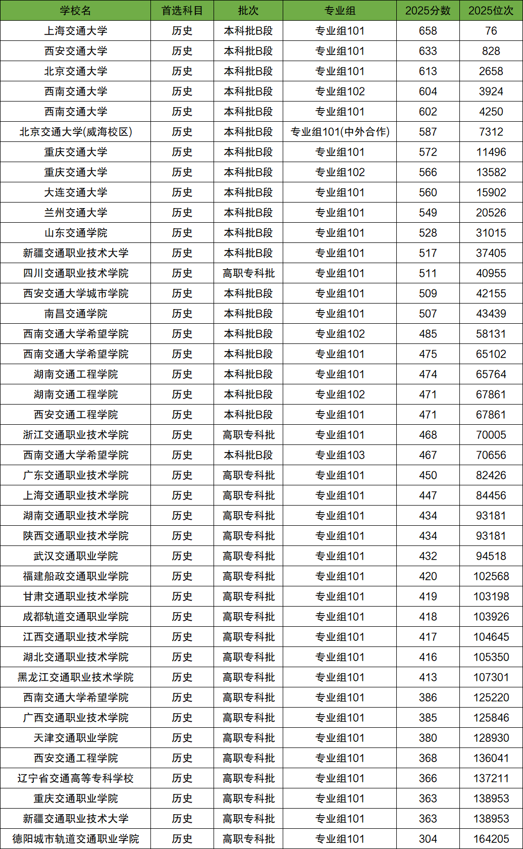 2025年一共有33所交通大學(xué)在四川歷史類招生,其中錄取分?jǐn)?shù)線最高的是上海交通大學(xué),該校最低分達658分,全省排名76名內(nèi)的同學(xué)有機會上。另外錄取位次位于上海交通大學(xué)之后的是西安交通大學(xué),學(xué)校最低分633分,錄取位次是828名。