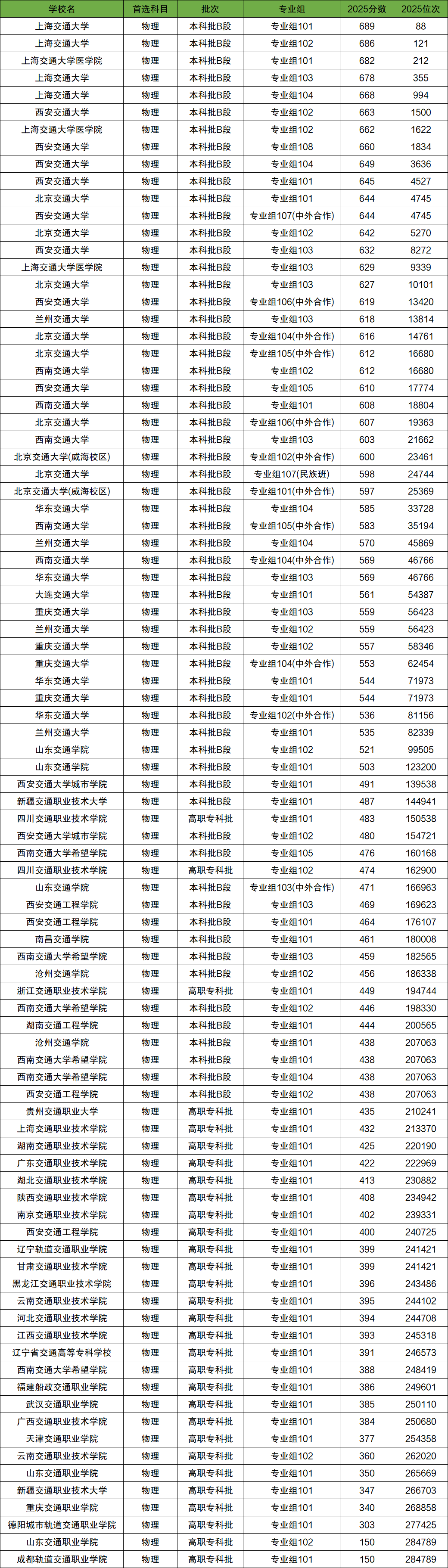 2025年一共有42所交通大學(xué)在四川物理類招生,其中錄取分?jǐn)?shù)線最高的是上海交通大學(xué)專業(yè)組101,最低分為689分,四川物理類考生想要上上海交通大學(xué)的話,最低得排在全省前88名以內(nèi)。