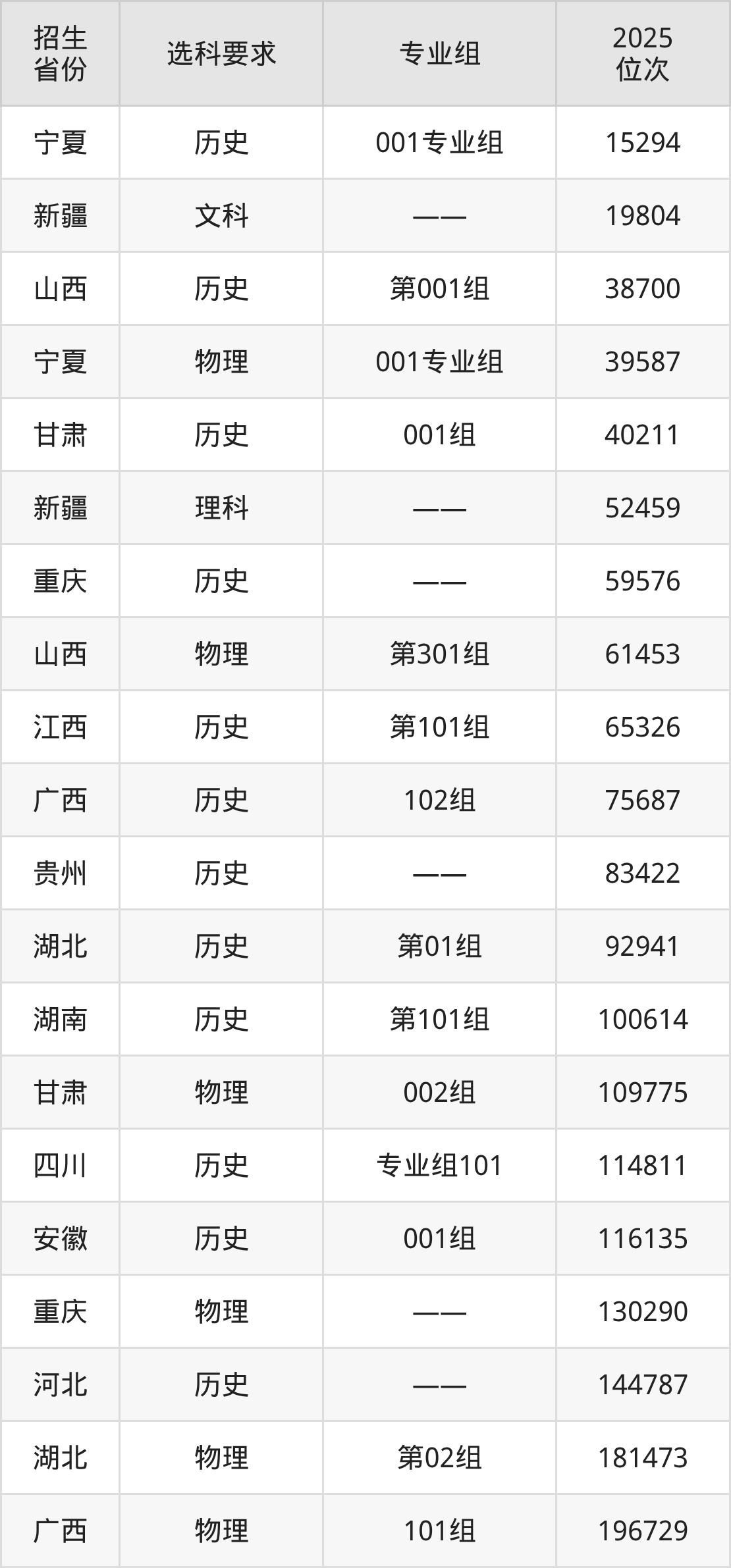 三明醫(yī)學科技職業(yè)學院2025年在全國各省的位次差異較大,最高位次是15294位(寧夏歷史類)、最低位次是326104位(河北物理類)。各省具體位次請看下圖: