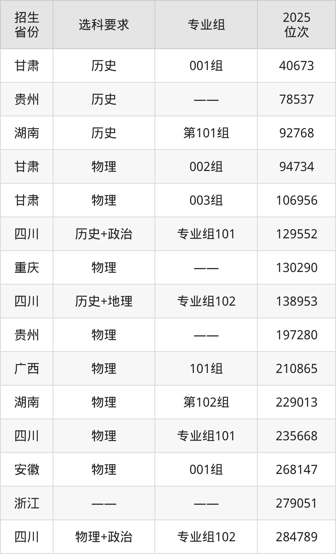 昆明工業(yè)職業(yè)技術(shù)學(xué)院2025年在全國各省的位次差異較大,最高位次是40673位(甘肅歷史類)、最低位次是284789位(四川物理類)。各省具體位次請看下圖: