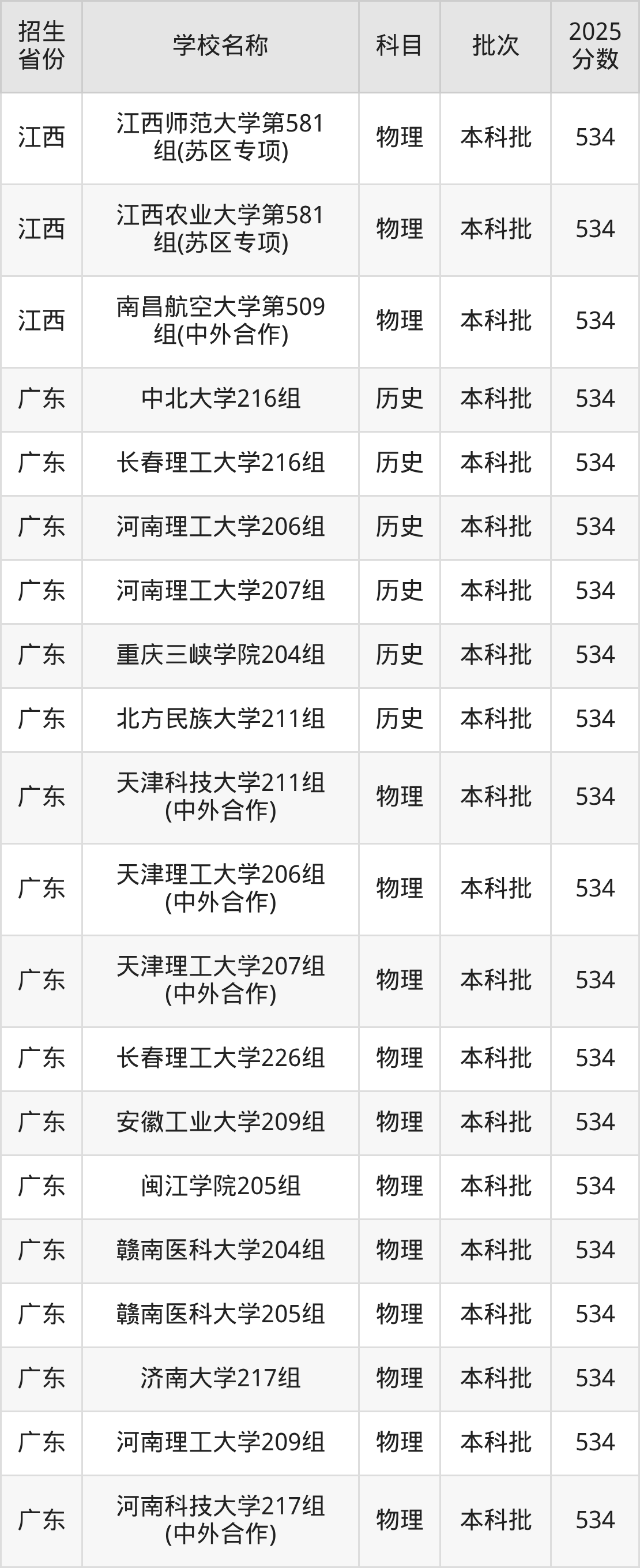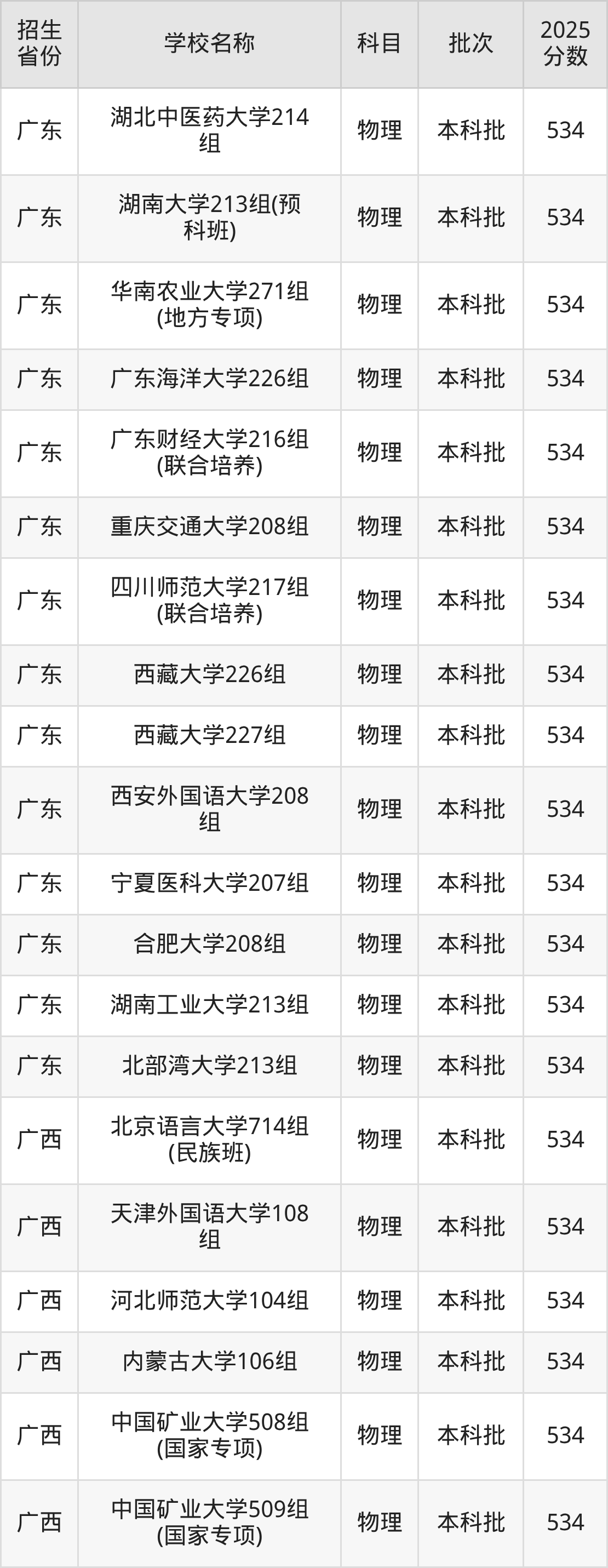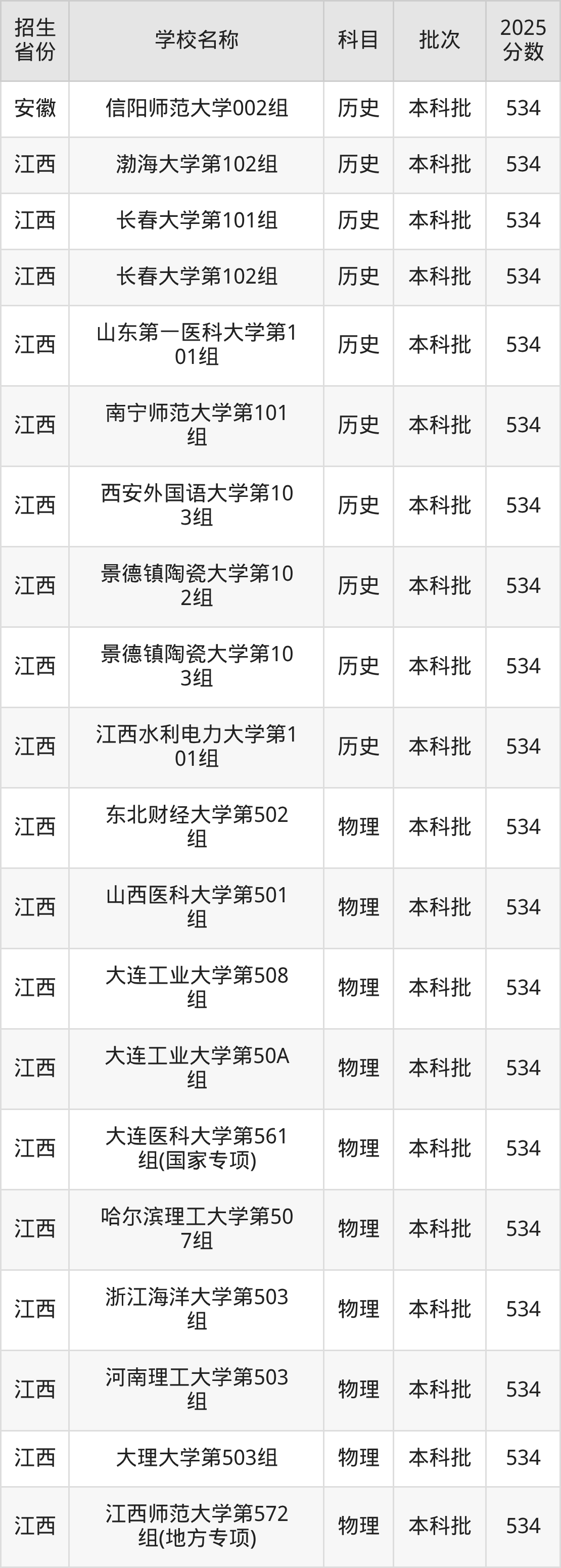 篩選全國各省2025年錄取分?jǐn)?shù)線為534分的一本大學(xué)如下: