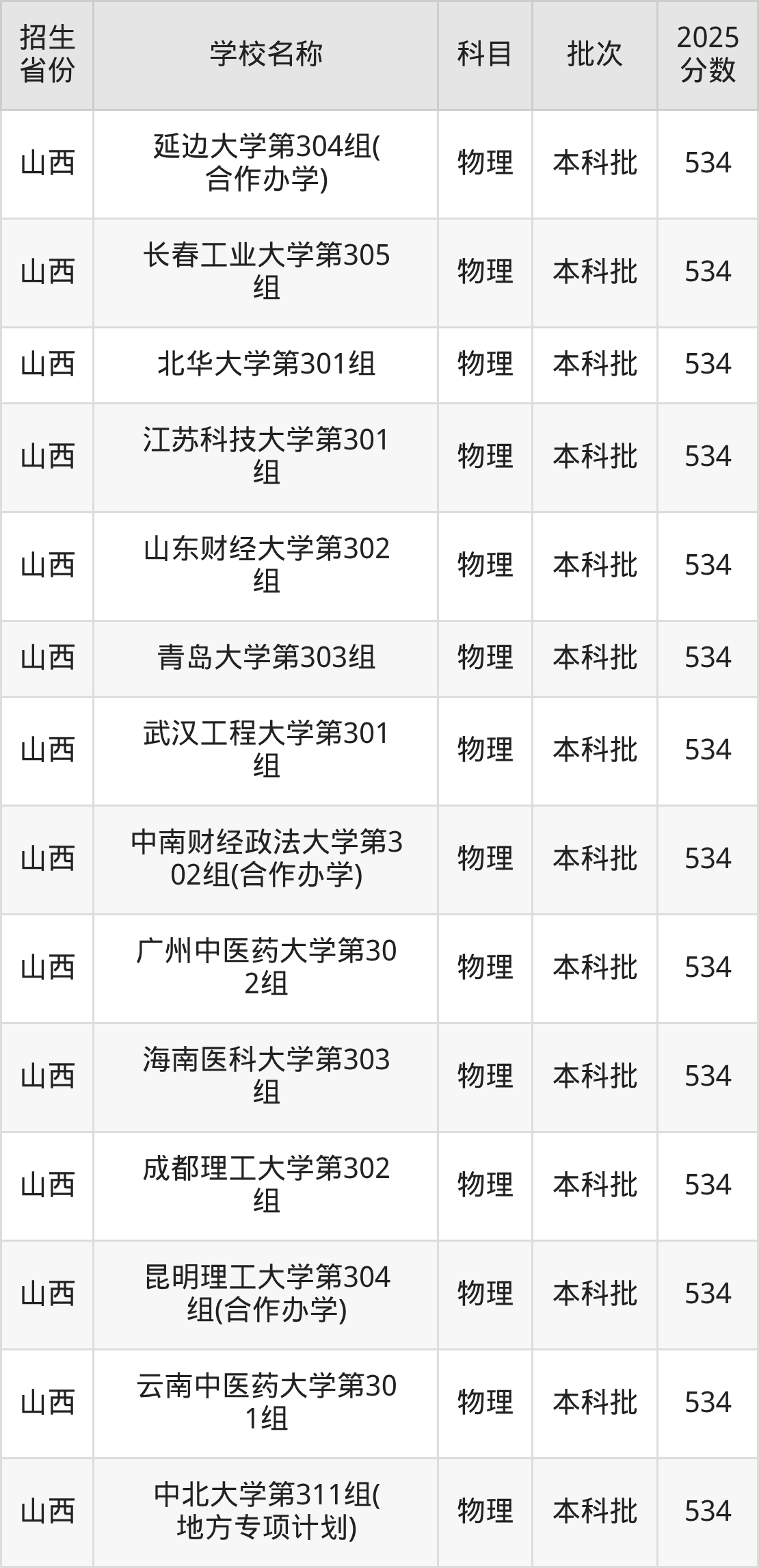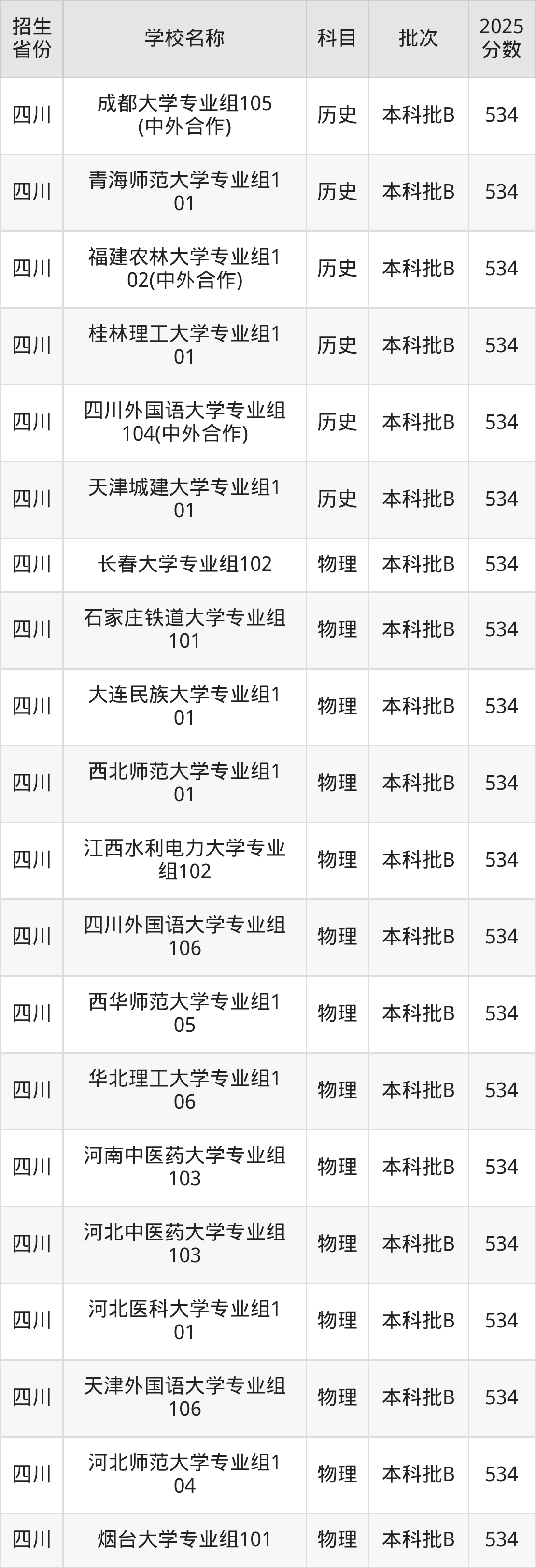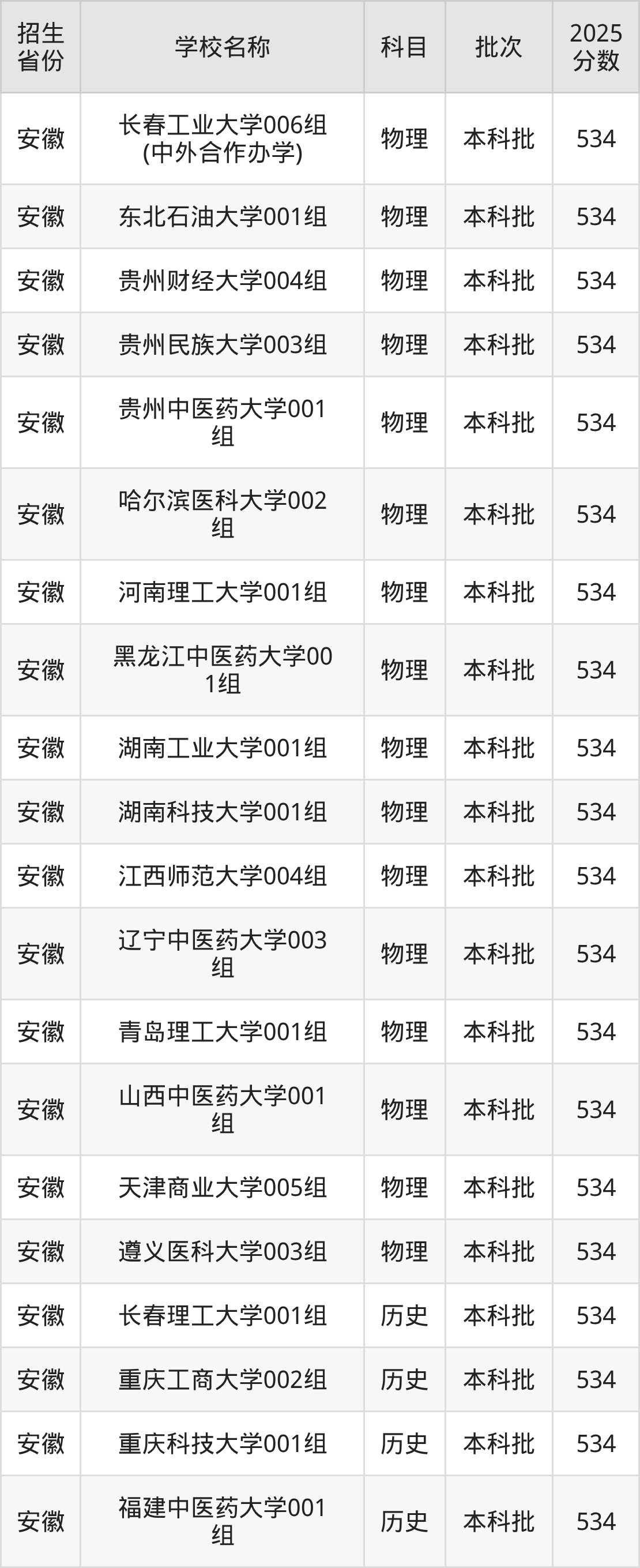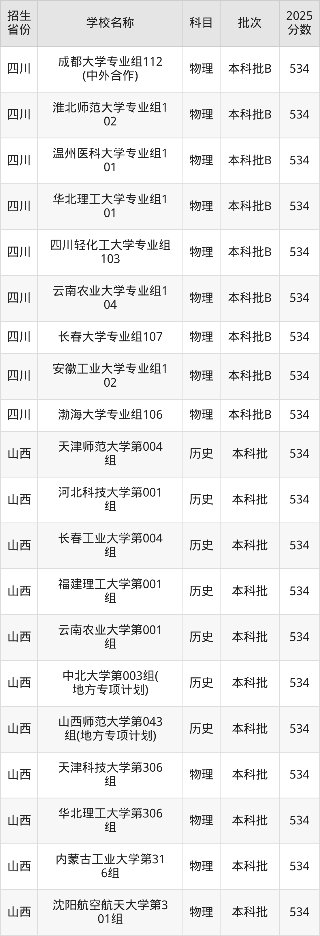 篩選全國各省2025年錄取分?jǐn)?shù)線為534分的一本大學(xué)如下: