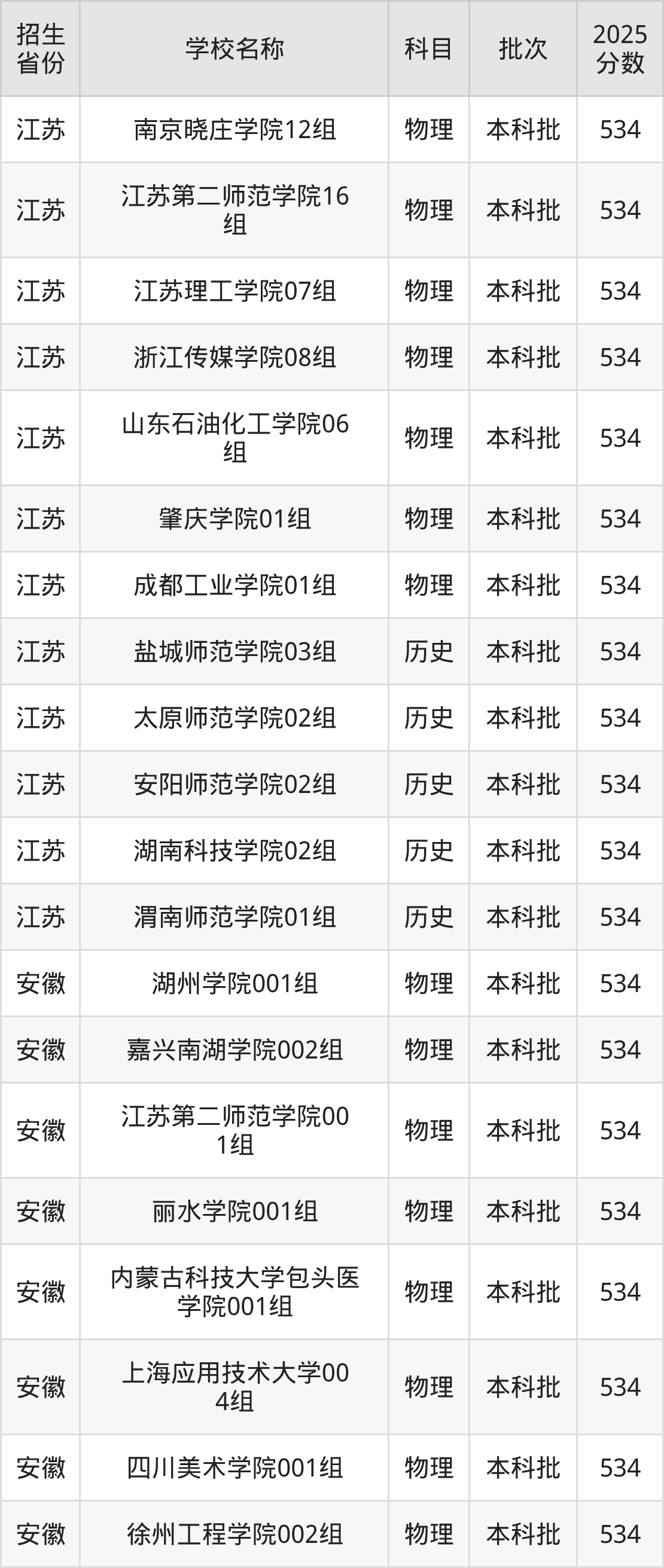 江蘇省歷史組分?jǐn)?shù)線是534分的二本公辦大學(xué)有:鹽城師范學(xué)院、太原師范學(xué)院、安陽師范學(xué)院、湖南科技學(xué)院、渭南師范學(xué)院。