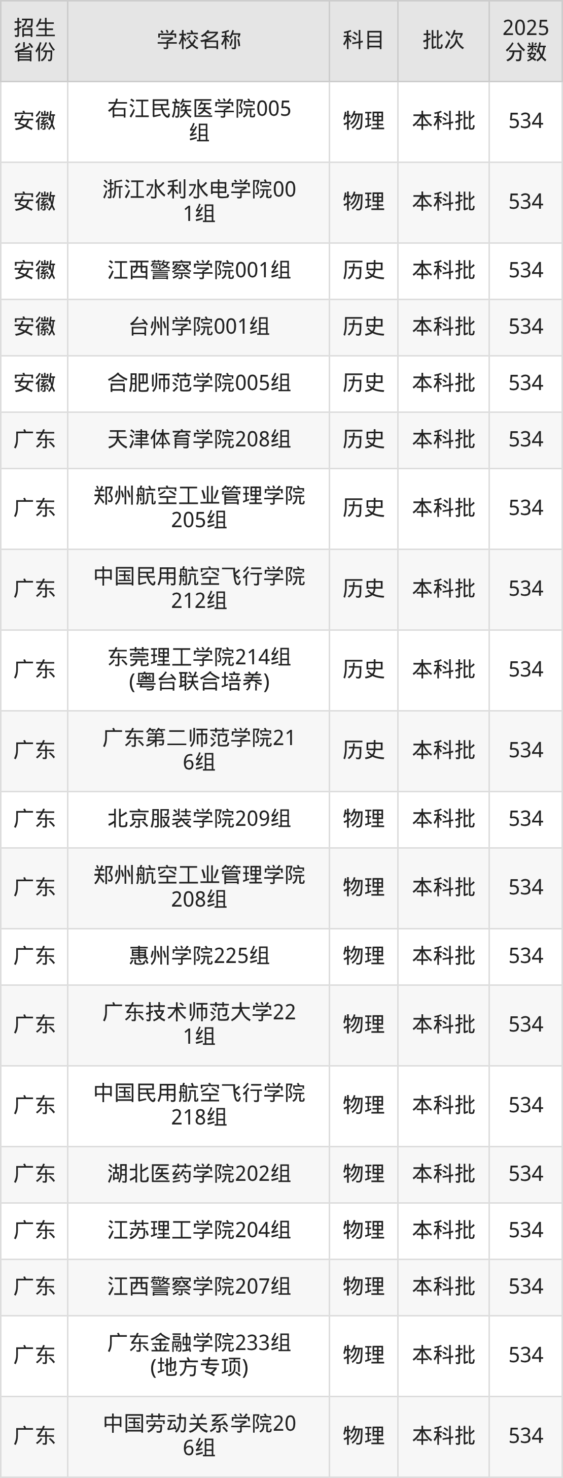廣東省歷史組分?jǐn)?shù)線是534分的二本公辦大學(xué)有:天津體育學(xué)院、鄭州航空工業(yè)管理學(xué)院、中國民用航空飛行學(xué)院、東莞理工學(xué)院、廣東第二師范學(xué)院。