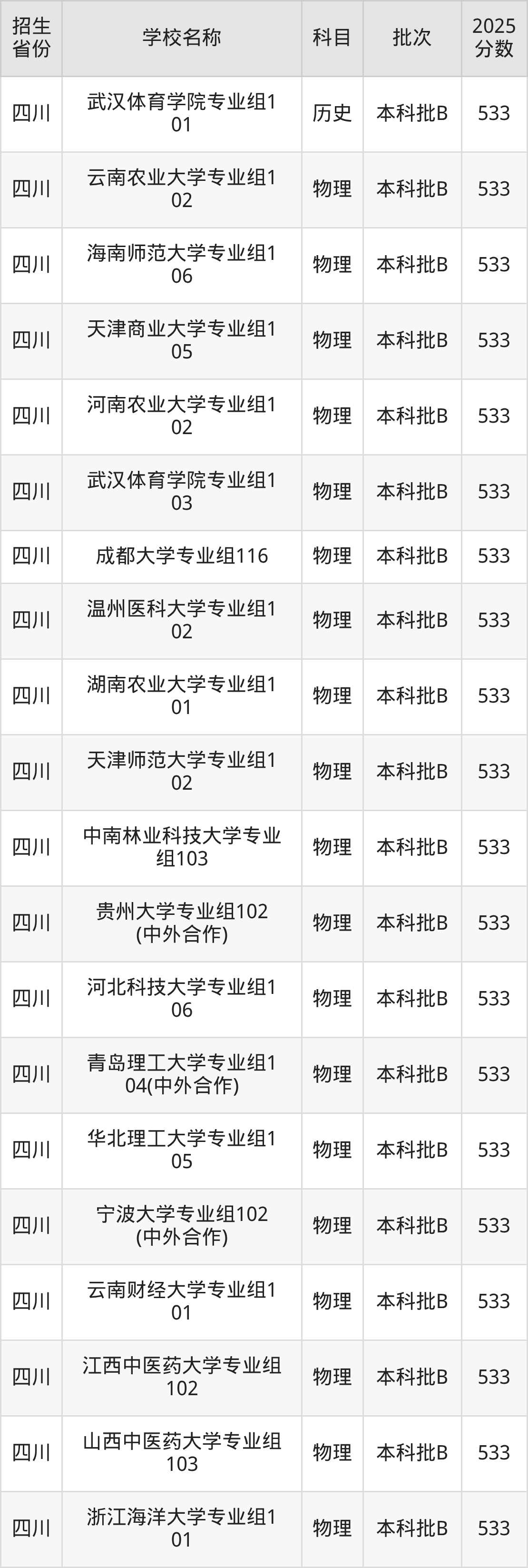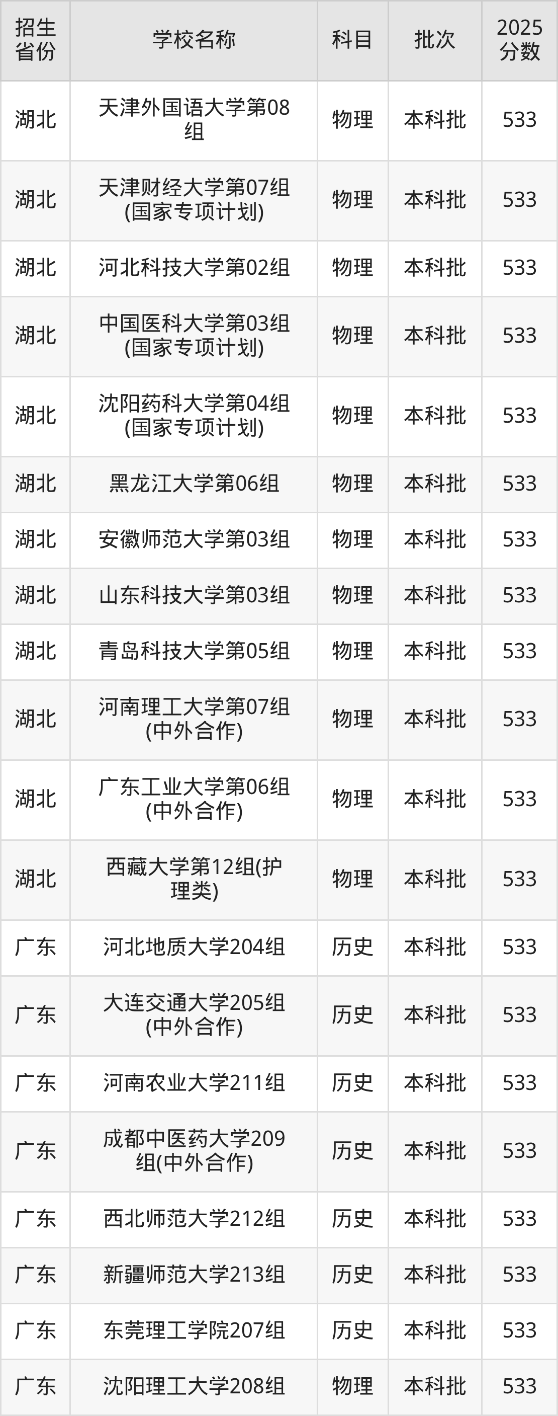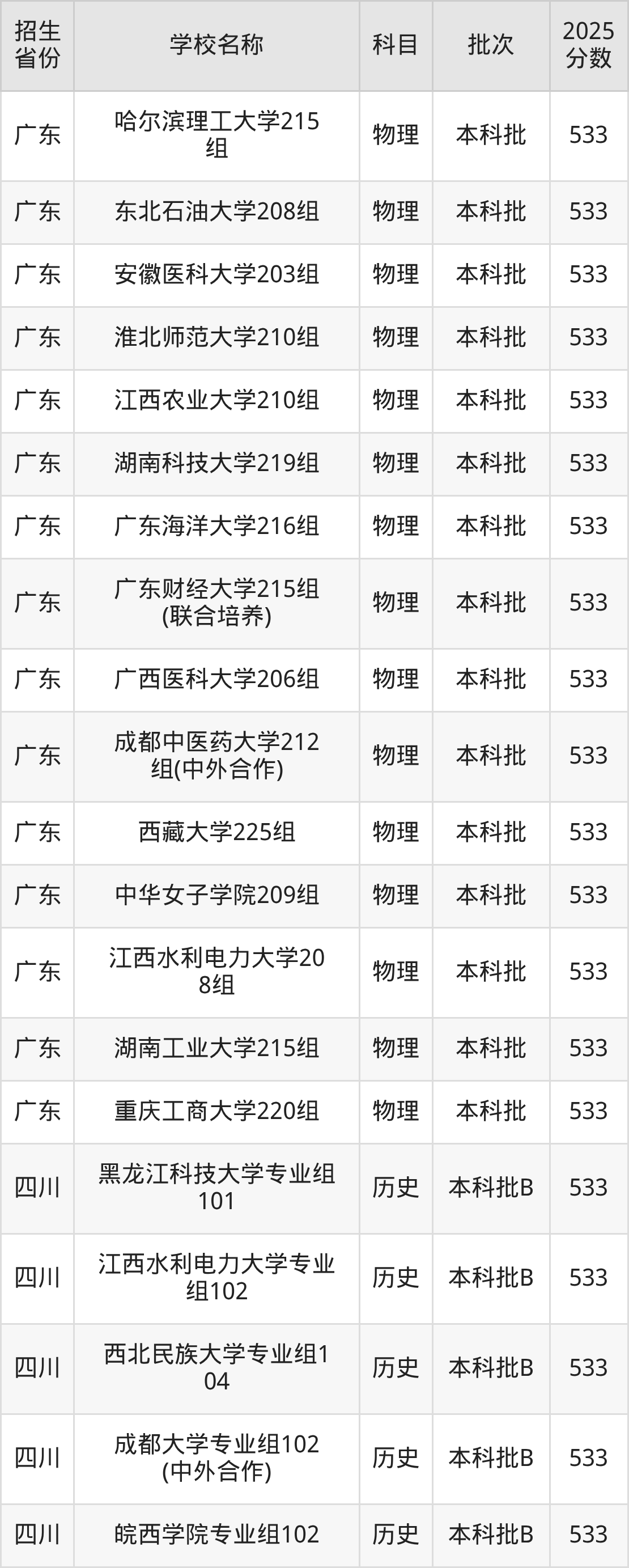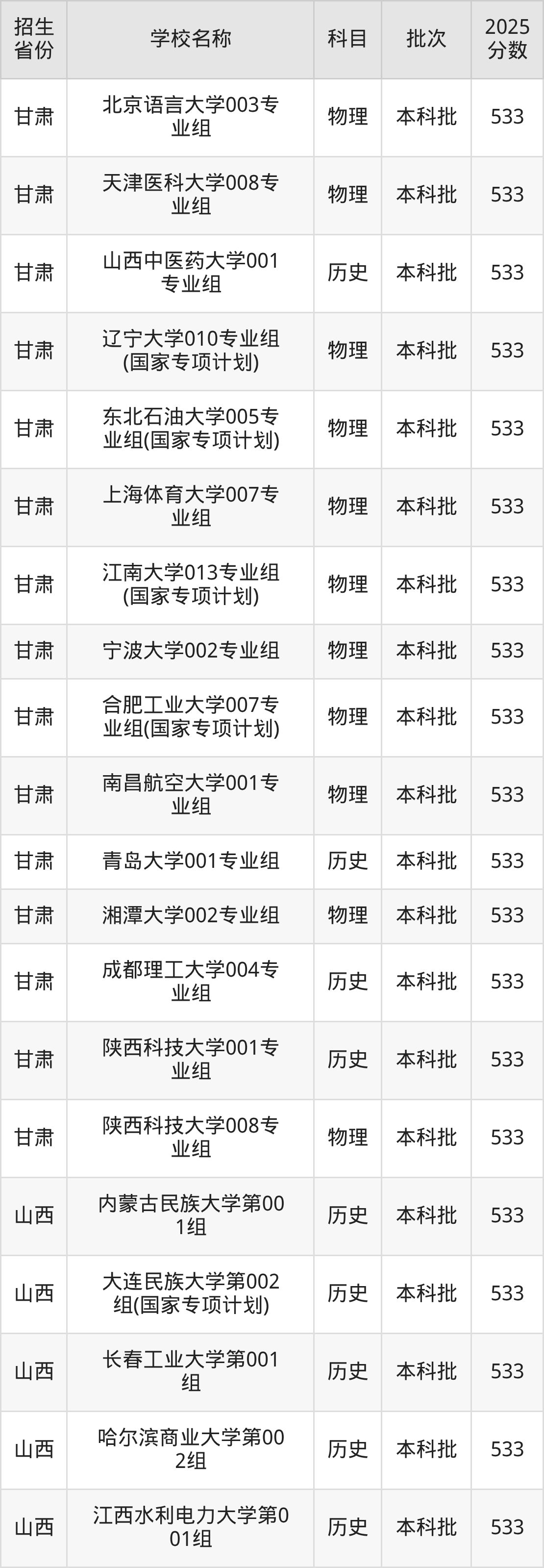 篩選全國各省2025年錄取分?jǐn)?shù)線為533分的重點(diǎn)大學(xué)如下: