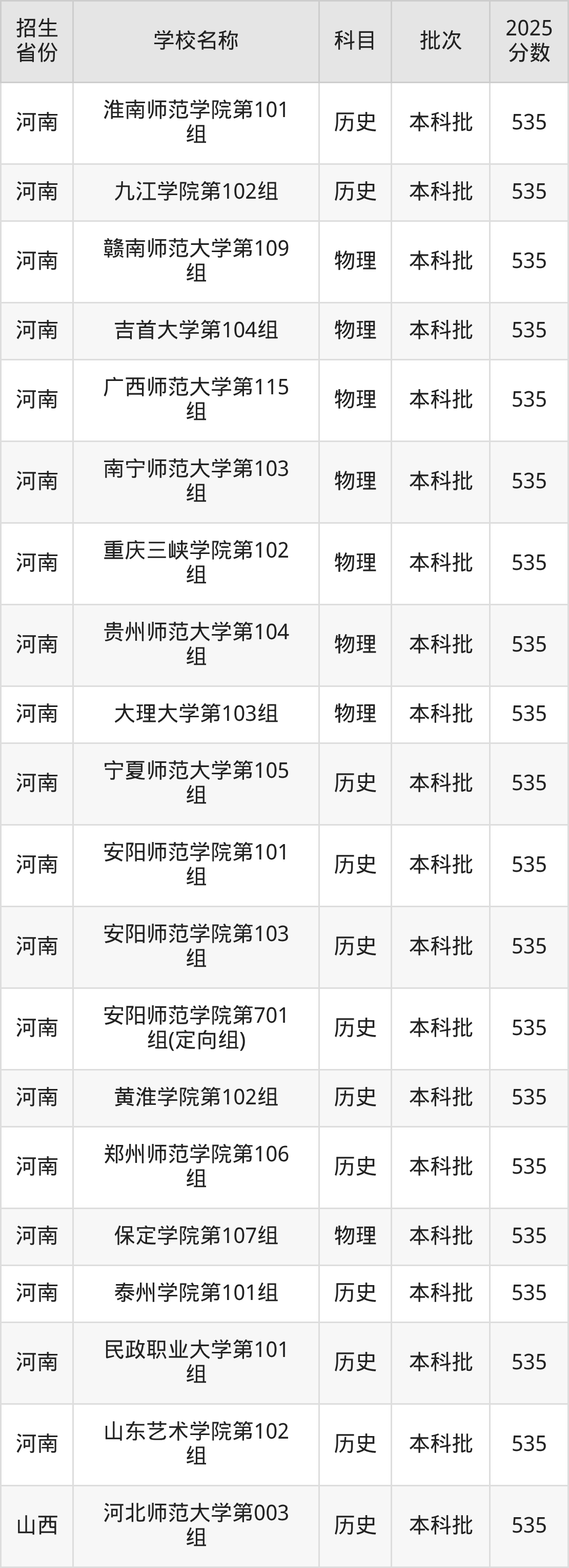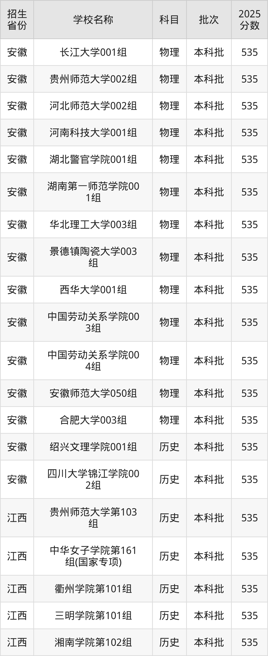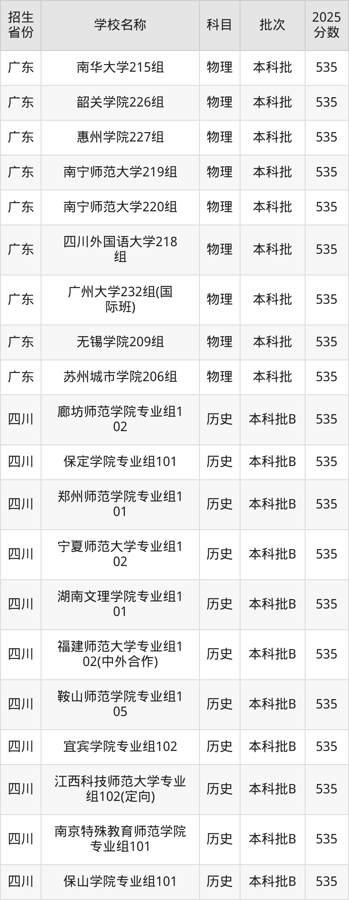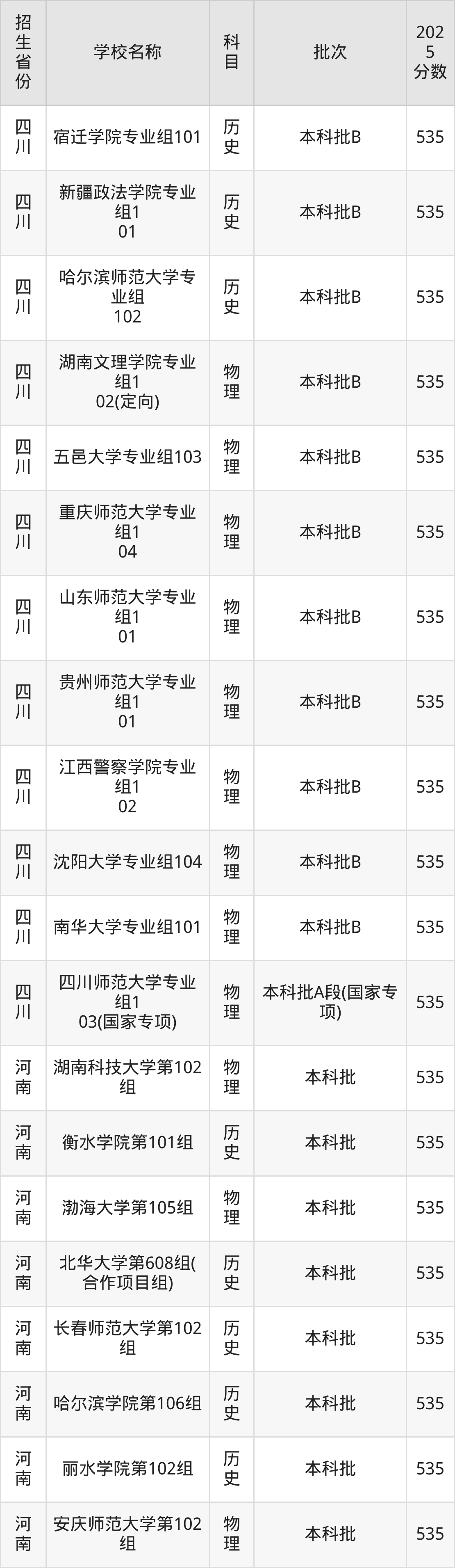 二、各省535分的文科大學(xué)名單