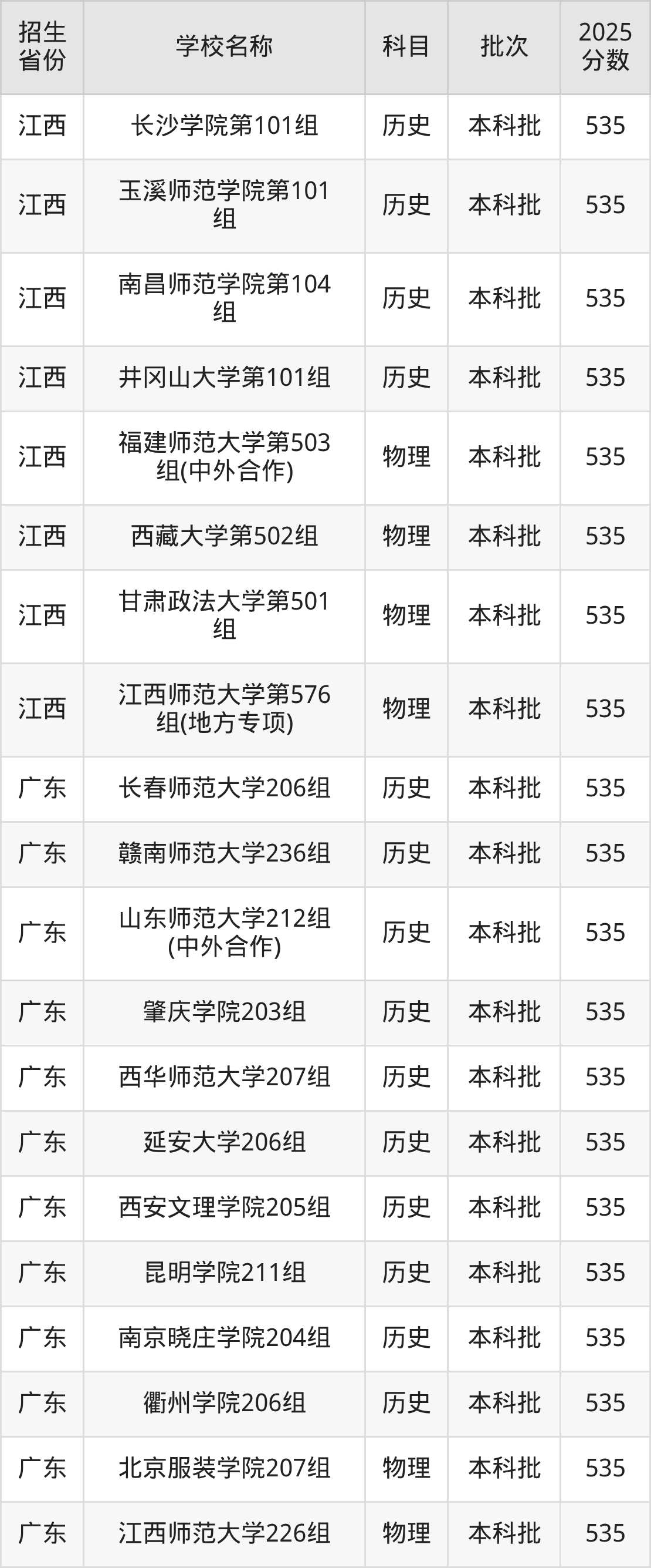 廣東省歷史組分?jǐn)?shù)線是535分的文科大學(xué)有:長(zhǎng)春師范大學(xué)、贛南師范大學(xué)、山東師范大學(xué)、肇慶學(xué)院、西華師范大學(xué)、延安大學(xué)、西安文理學(xué)院、昆明學(xué)院、南京曉莊學(xué)院、衢州學(xué)院。