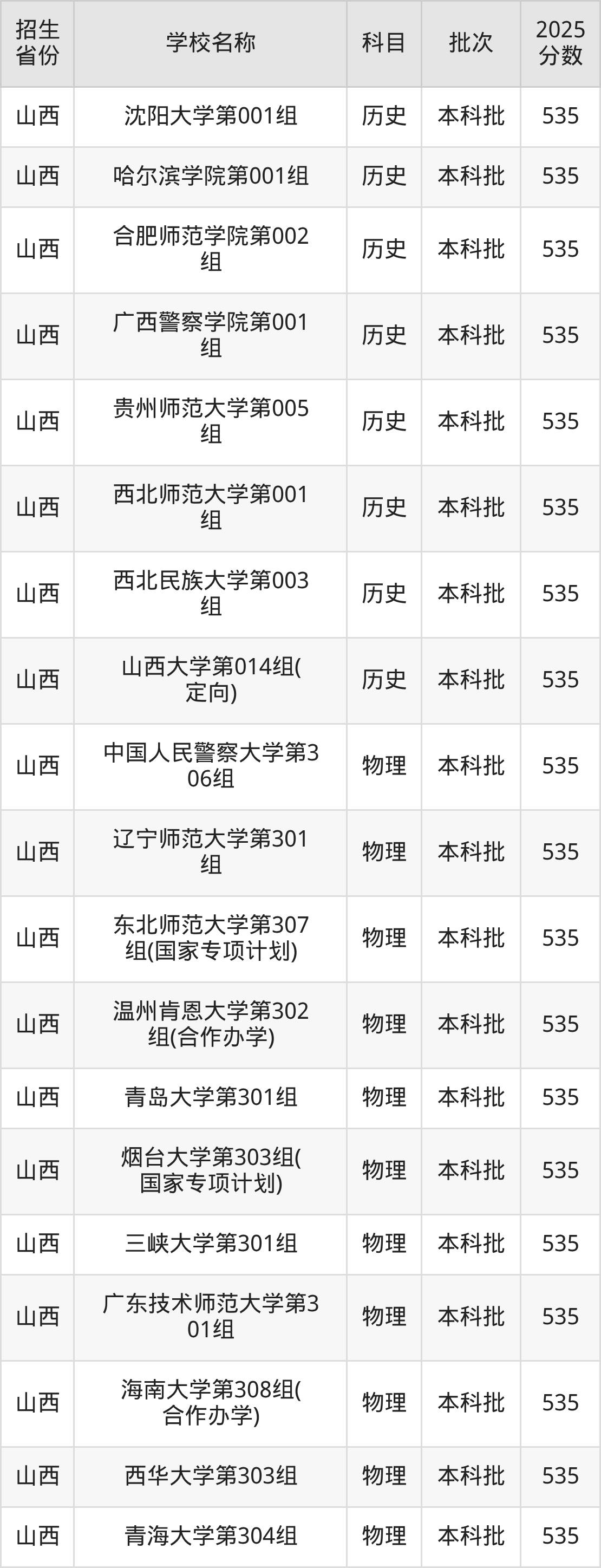 山西省歷史組分?jǐn)?shù)線是535分的文科大學(xué)有:河北師范大學(xué)、沈陽(yáng)大學(xué)、哈爾濱學(xué)院、合肥師范學(xué)院、廣西警察學(xué)院、貴州師范大學(xué)、西北師范大學(xué)、西北民族大學(xué)、山西大學(xué)。
