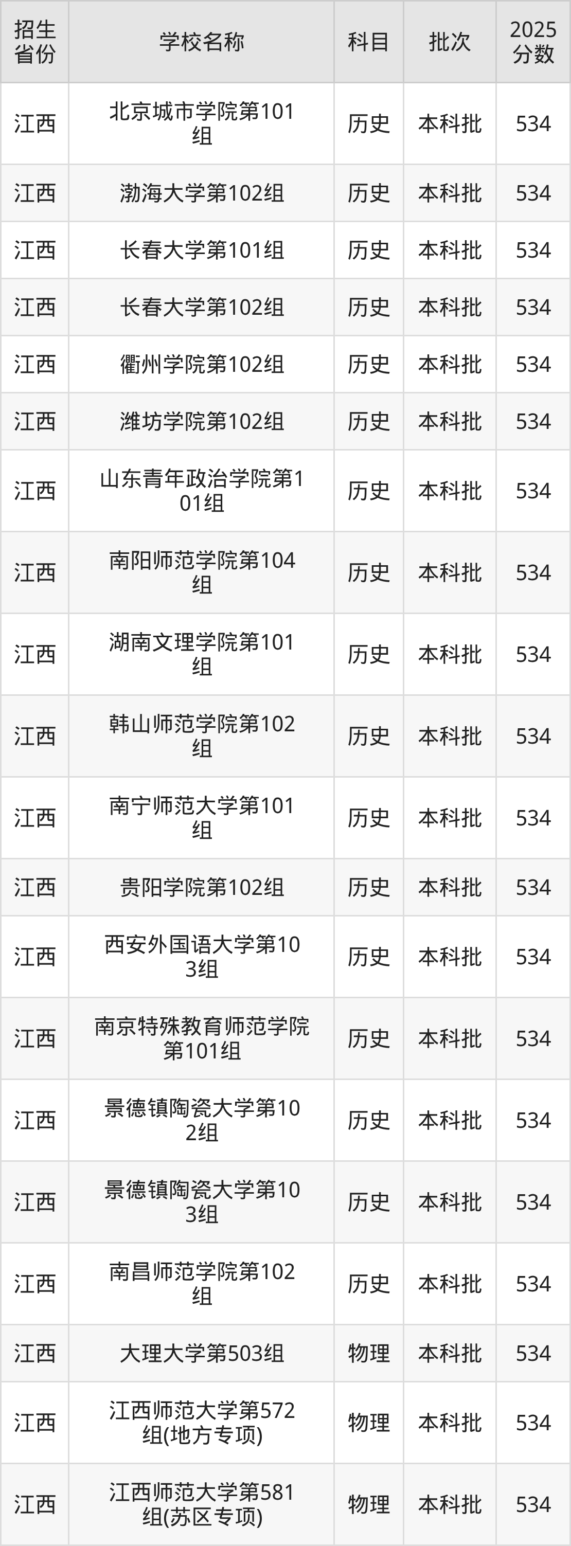 江西省歷史組分數(shù)線是534分的文科大學(xué)有:北京城市學(xué)院、渤海大學(xué)、長春大學(xué)、衢州學(xué)院、濰坊學(xué)院、山東青年政治學(xué)院、南陽師范學(xué)院、湖南文理學(xué)院、韓山師范學(xué)院、南寧師范大學(xué)。