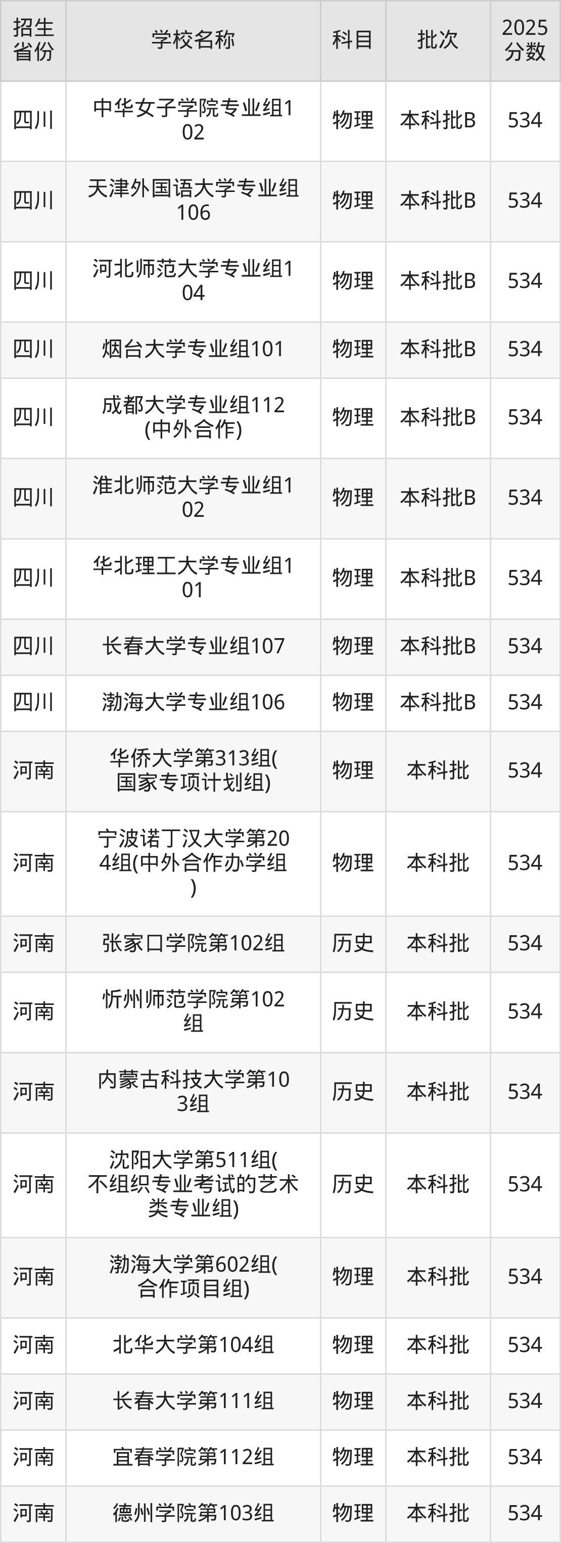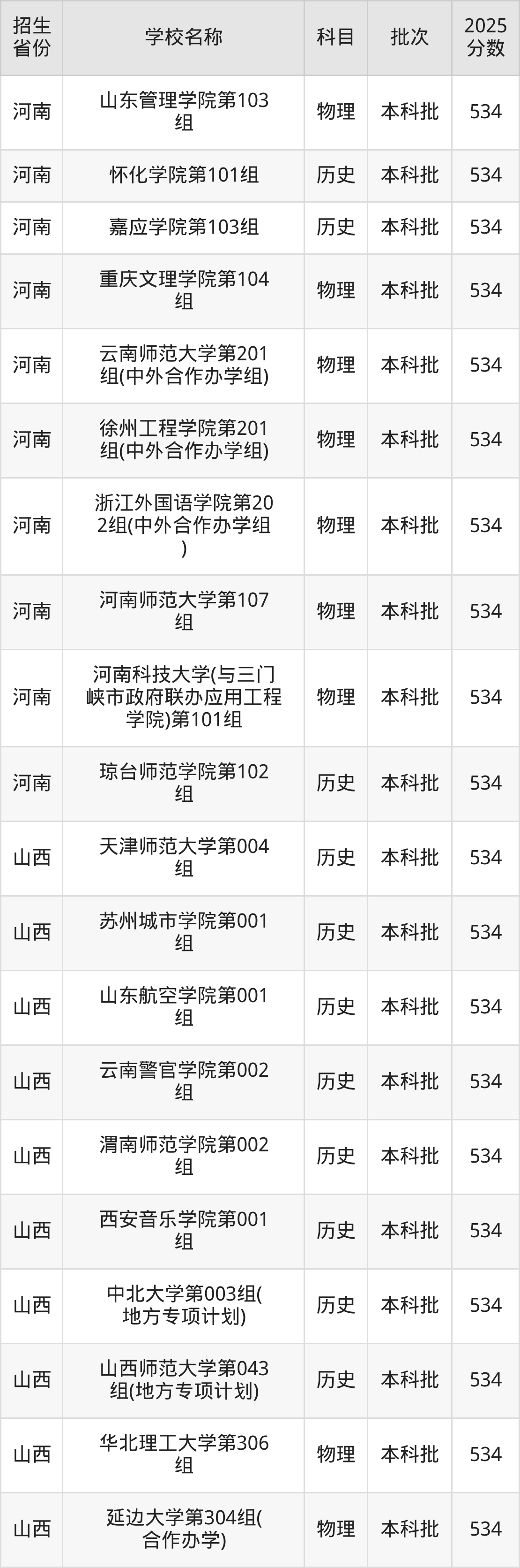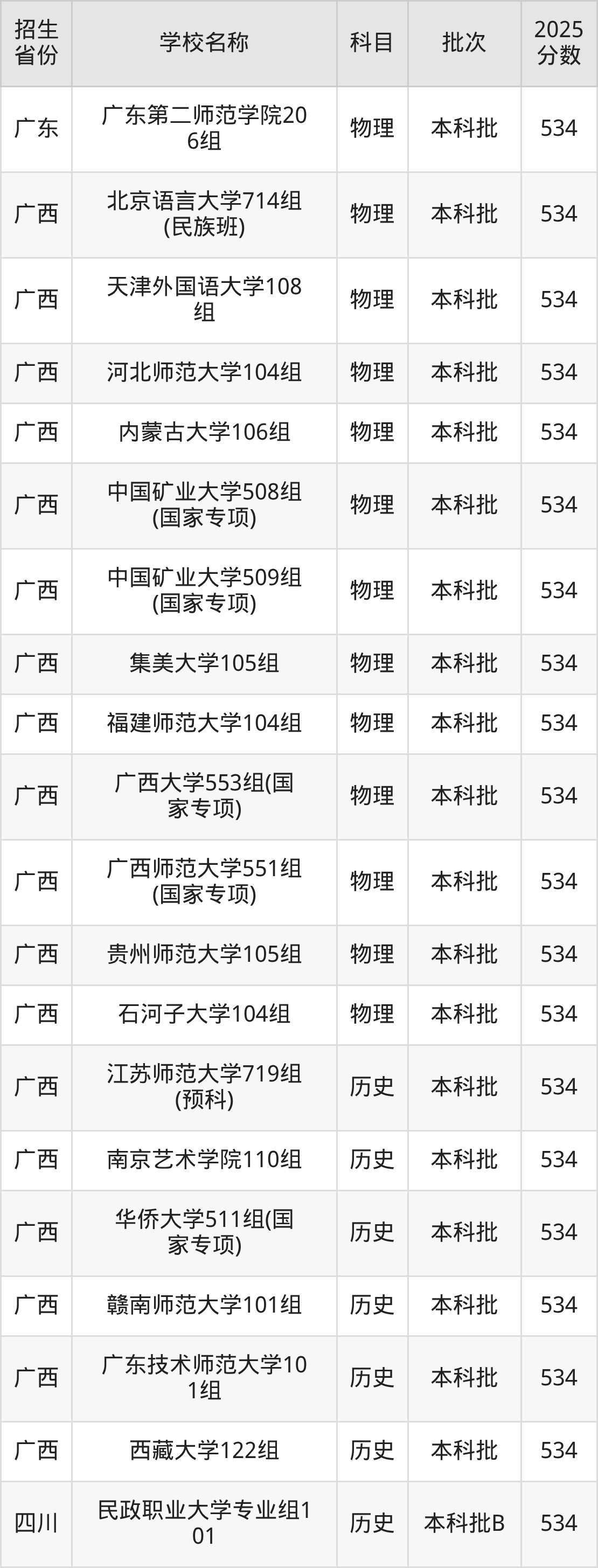 篩選全國各省2025年錄取分數(shù)線為534分的文科大學(xué)如下: