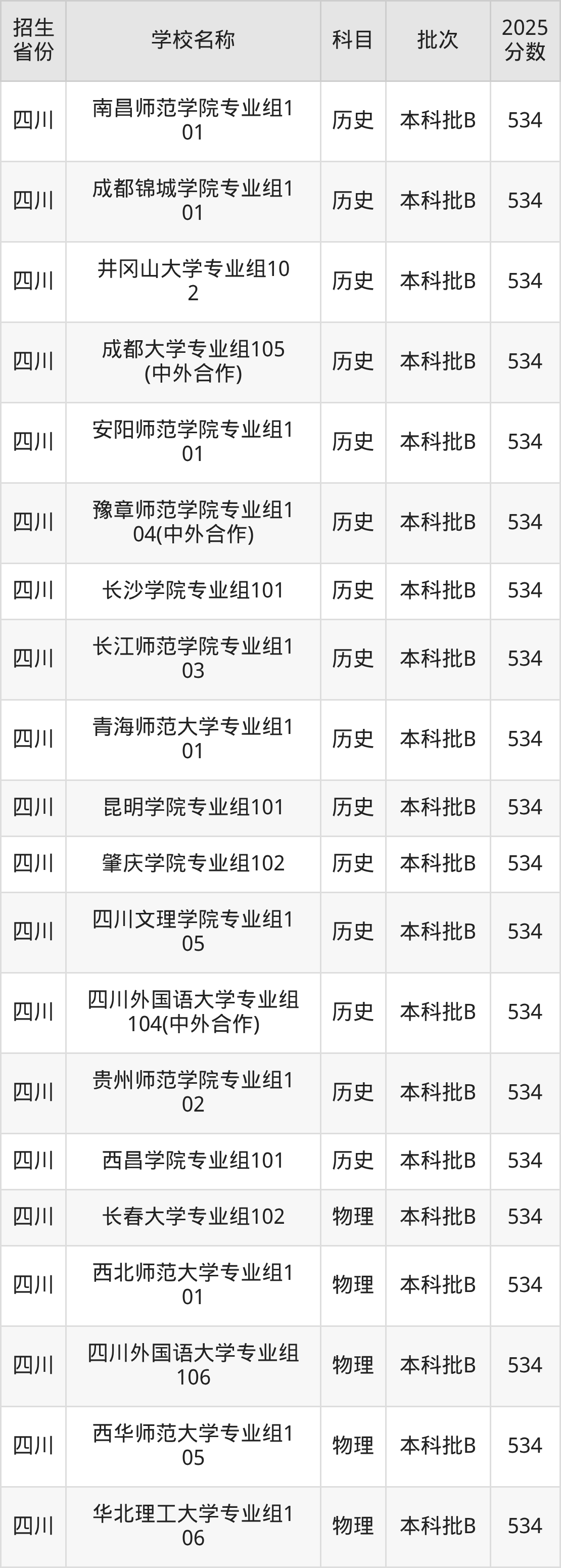 四川省歷史組分數(shù)線是534分的文科大學(xué)有:民政職業(yè)大學(xué)、南昌師范學(xué)院、成都錦城學(xué)院、井岡山大學(xué)、成都大學(xué)、安陽師范學(xué)院、豫章師范學(xué)院、長沙學(xué)院、長江師范學(xué)院、青海師范大學(xué)。