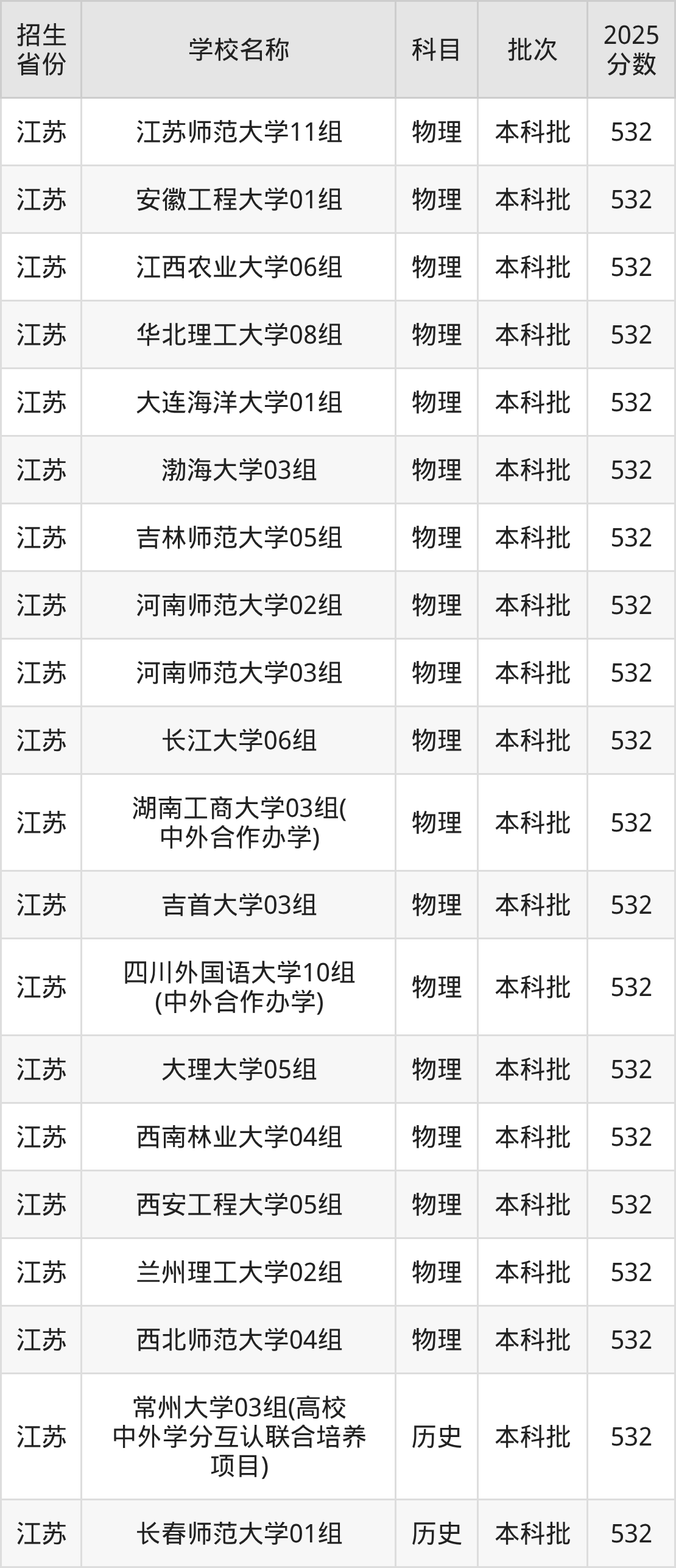 江蘇省歷史組分?jǐn)?shù)線是532分的一本大學(xué)有:常州大學(xué)、長春師范大學(xué)。