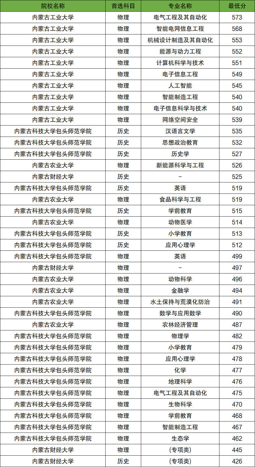 以內(nèi)蒙古工業(yè)大學(xué)為例,物理類(lèi)各個(gè)專(zhuān)業(yè)最低分?jǐn)?shù)線如下: