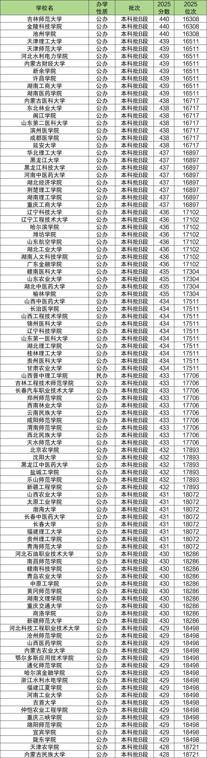 本科線上錄取分?jǐn)?shù)線最高的是吉林師范大學(xué)、金陵科技學(xué)院、池州學(xué)院,2025年最低分是440分,位次為16308名。最低分超437分的大學(xué)名單還包括河北水利電力學(xué)院(439分)、內(nèi)蒙古財(cái)經(jīng)大學(xué)(439分)、湖南醫(yī)藥學(xué)院(439分)、內(nèi)蒙古醫(yī)科大學(xué)(438分)等,這些大學(xué)錄取位次在前1.7萬(wàn)名。