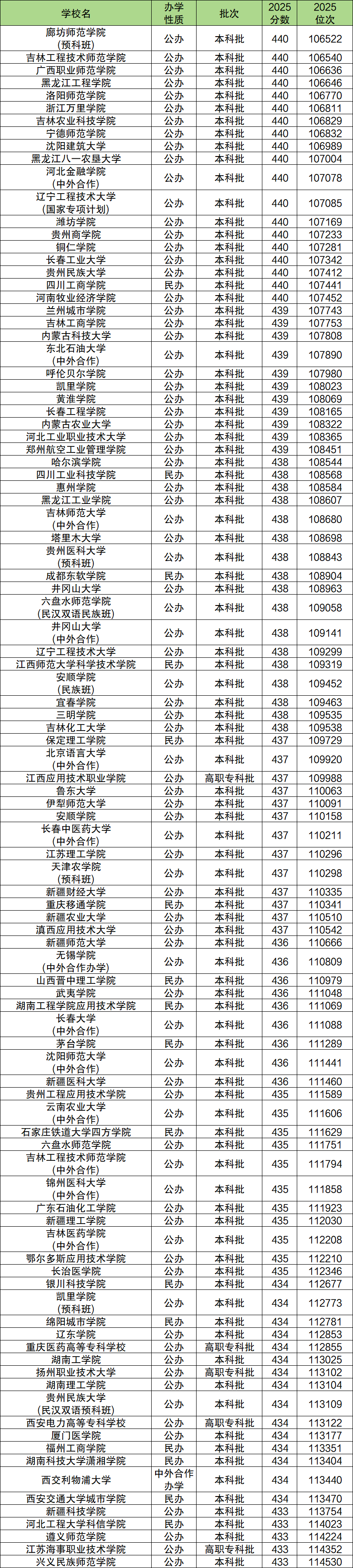 本科線上錄取分?jǐn)?shù)線最高的是廊坊師范學(xué)院(預(yù)科班)、吉林工程技術(shù)師范學(xué)院、廣西職業(yè)師范學(xué)院、黑龍江工程學(xué)院等,2025年最低分是440分,位次為106522名。最低分超438分的大學(xué)名單還包括長(zhǎng)春工程學(xué)院(439分)、內(nèi)蒙古農(nóng)業(yè)大學(xué)(439分)、河北工業(yè)職業(yè)技術(shù)大學(xué)(439分)、鄭州航空工業(yè)管理學(xué)院(439分)等,這些大學(xué)錄取位次在前10.9萬(wàn)名。