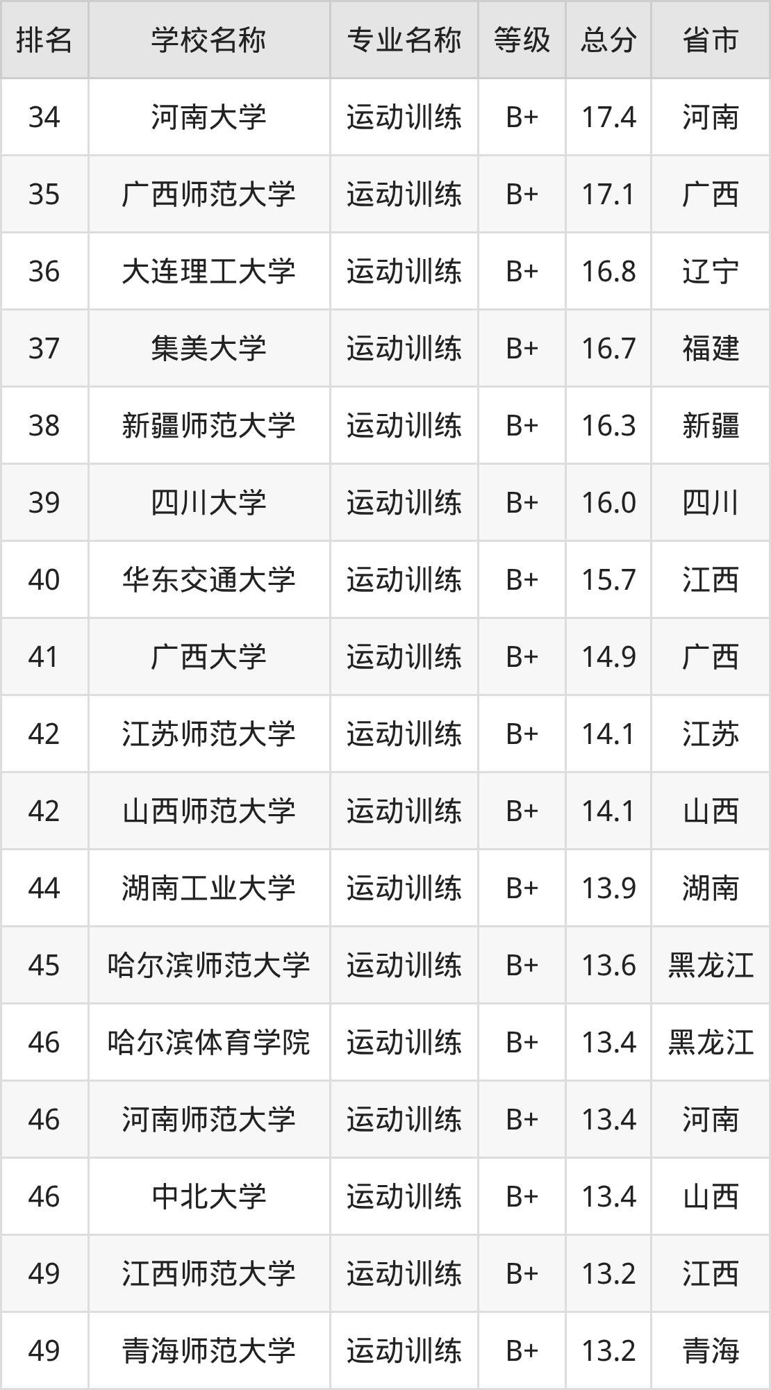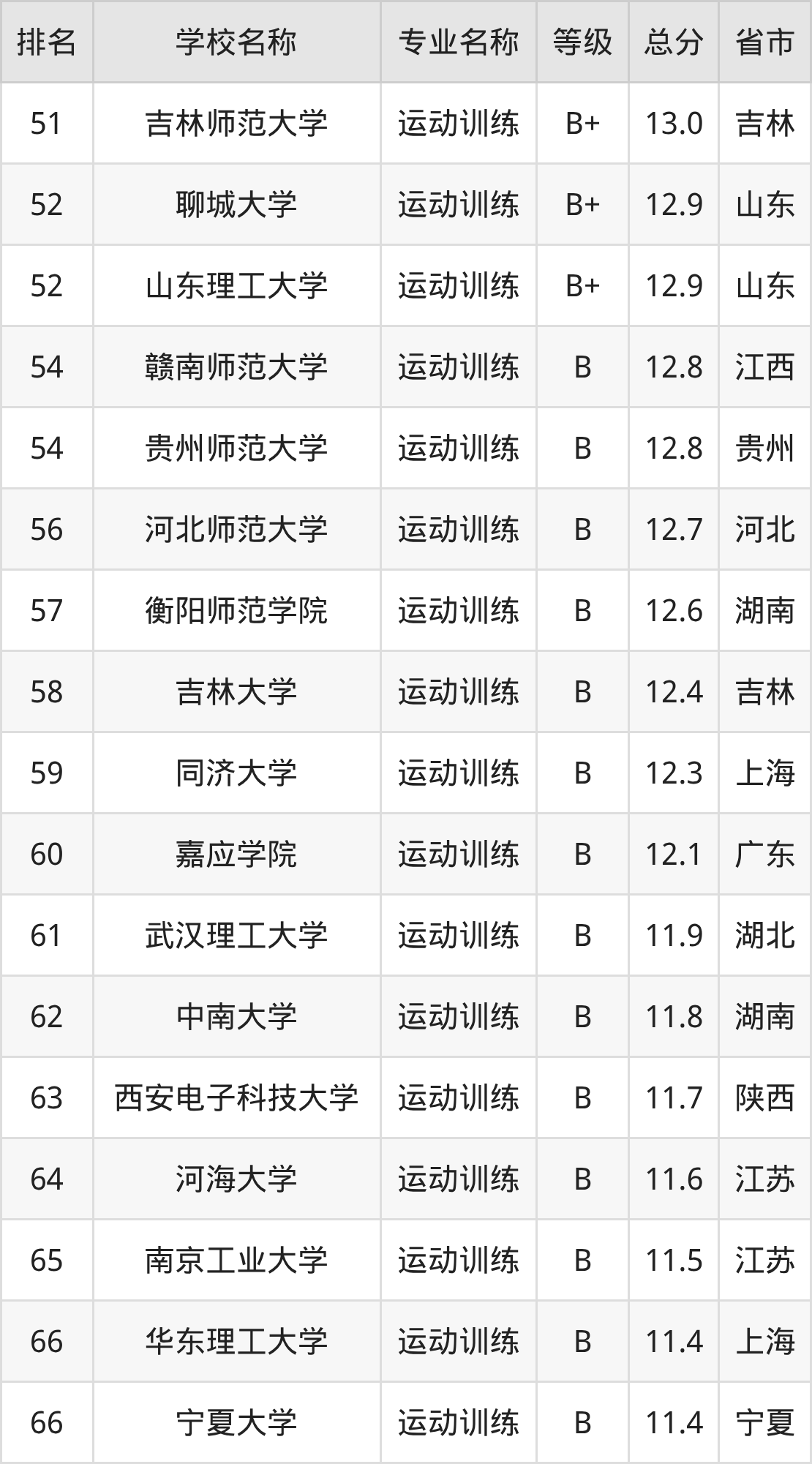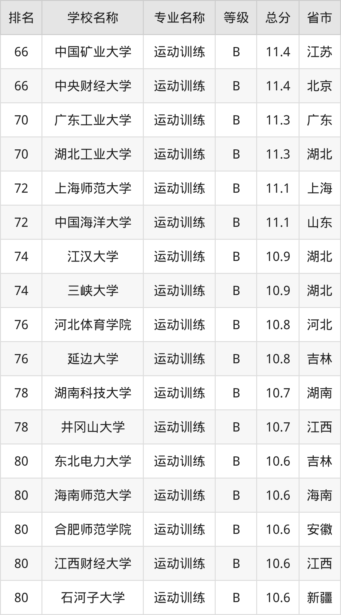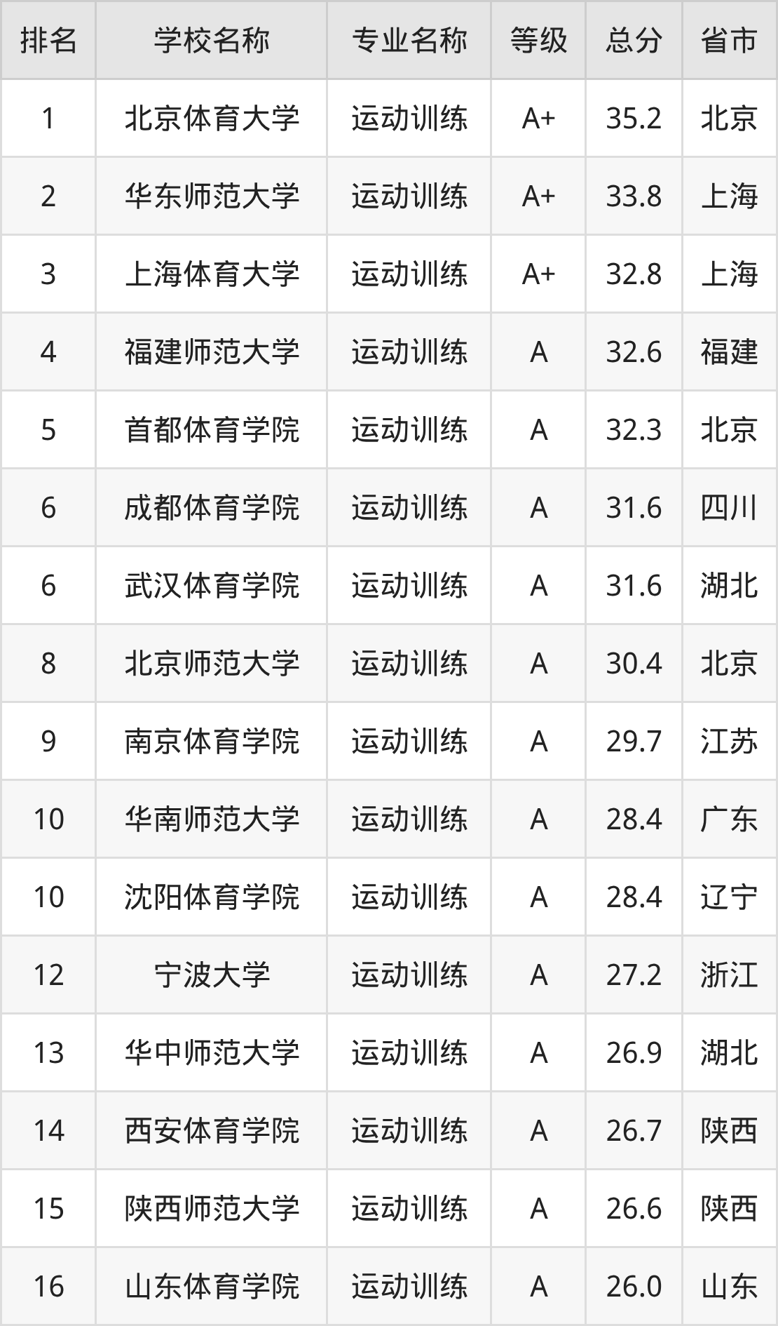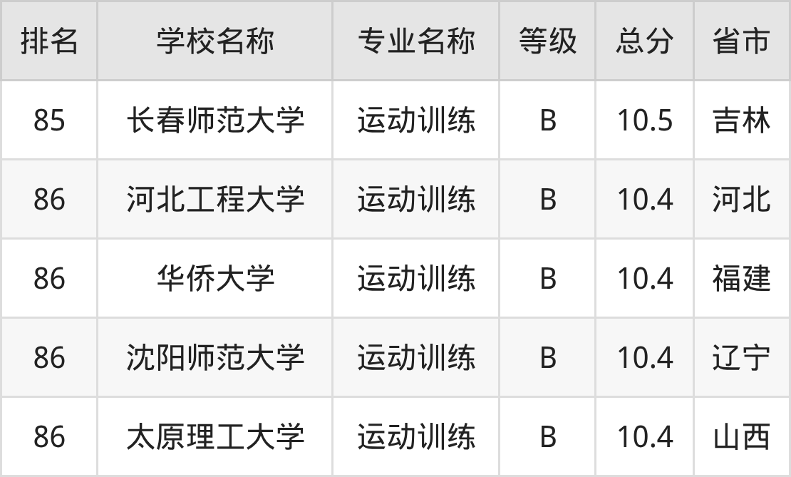 根據(jù)軟科榜單可知,運動訓練專業(yè)全國排名前十的大學分別是: