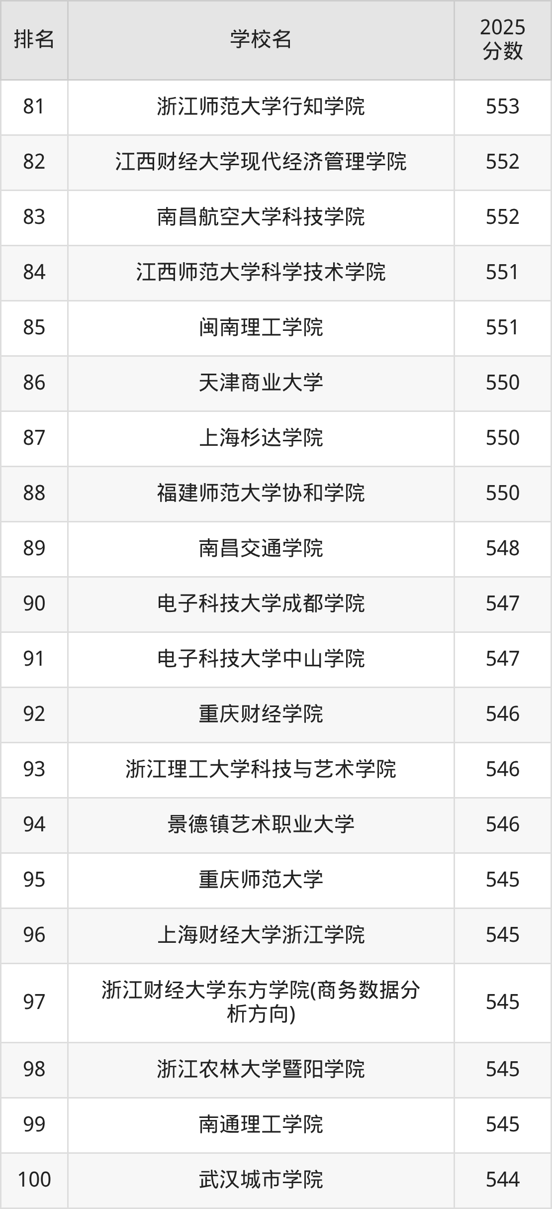 電子商務(wù)專業(yè)排名前100的大學(xué)中,收分較低的有武漢城市學(xué)院(544分)、南通理工學(xué)院(545分)、浙江農(nóng)林大學(xué)暨陽(yáng)學(xué)院(545分)、浙江財(cái)經(jīng)大學(xué)東方學(xué)院(商務(wù)數(shù)據(jù)分析方向)(545分)、上海財(cái)經(jīng)大學(xué)浙江學(xué)院(545分)。