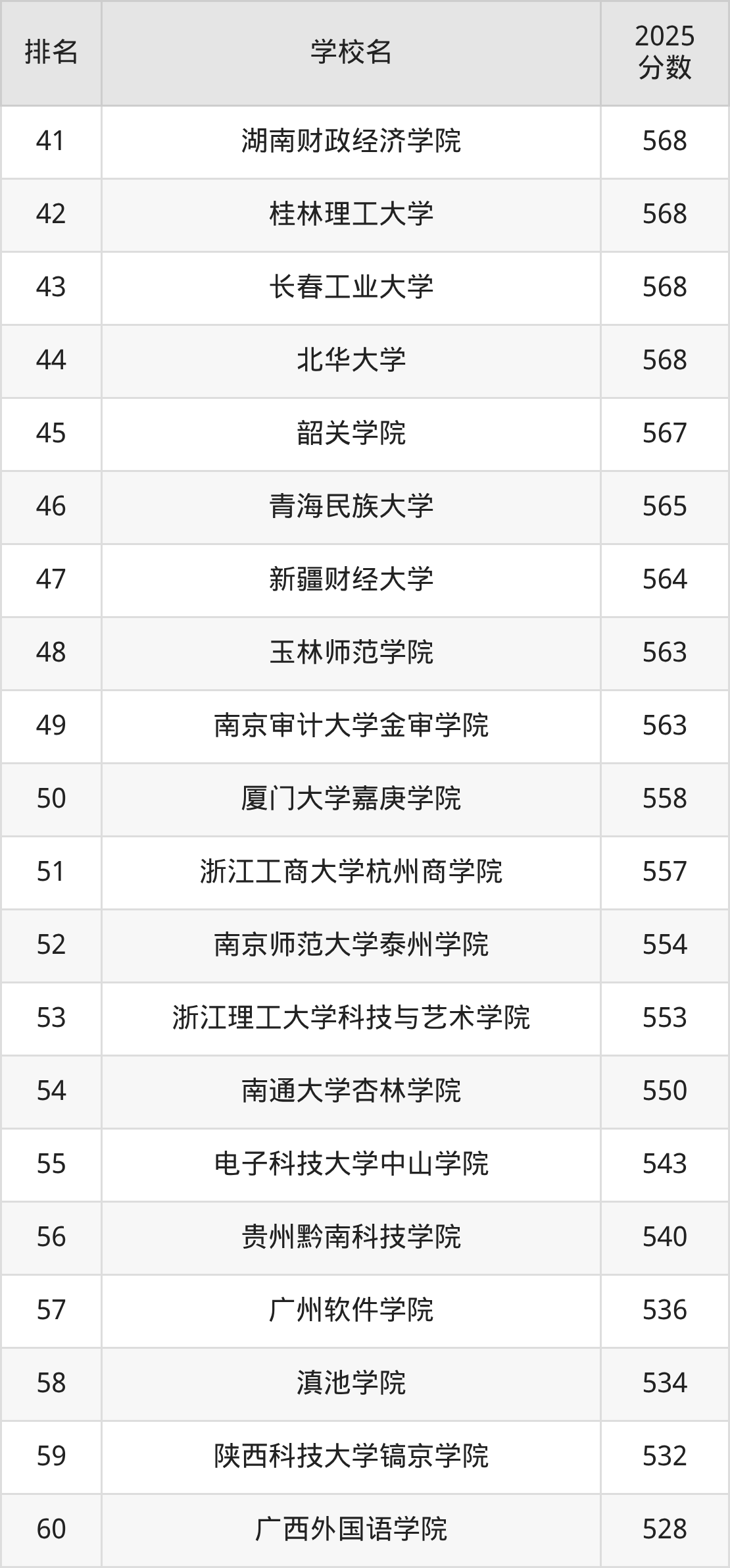行政管理專業(yè)排名前60的大學(xué)中,收分較低的有遼寧財(cái)貿(mào)學(xué)院(521分)、三亞學(xué)院(526分)、廣西外國(guó)語(yǔ)學(xué)院(528分)、陜西科技大學(xué)鎬京學(xué)院(532分)、滇池學(xué)院(534分)。