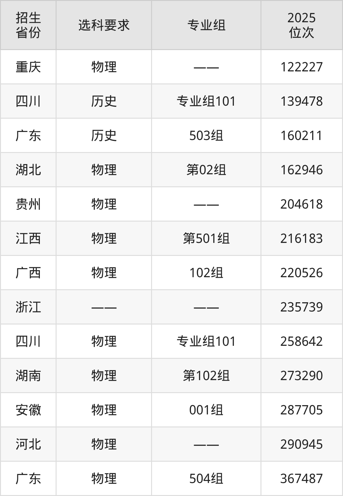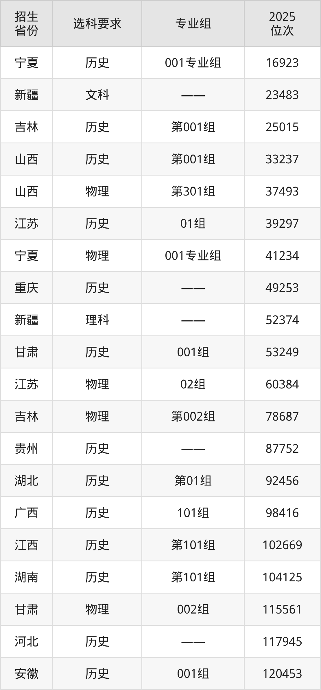 湖南城建職業(yè)技術學院2025年在全國各省的位次差異較大,最高位次是16923位(寧夏歷史類)、最低位次是367487位(廣東物理類)。各省具體位次請看下圖: