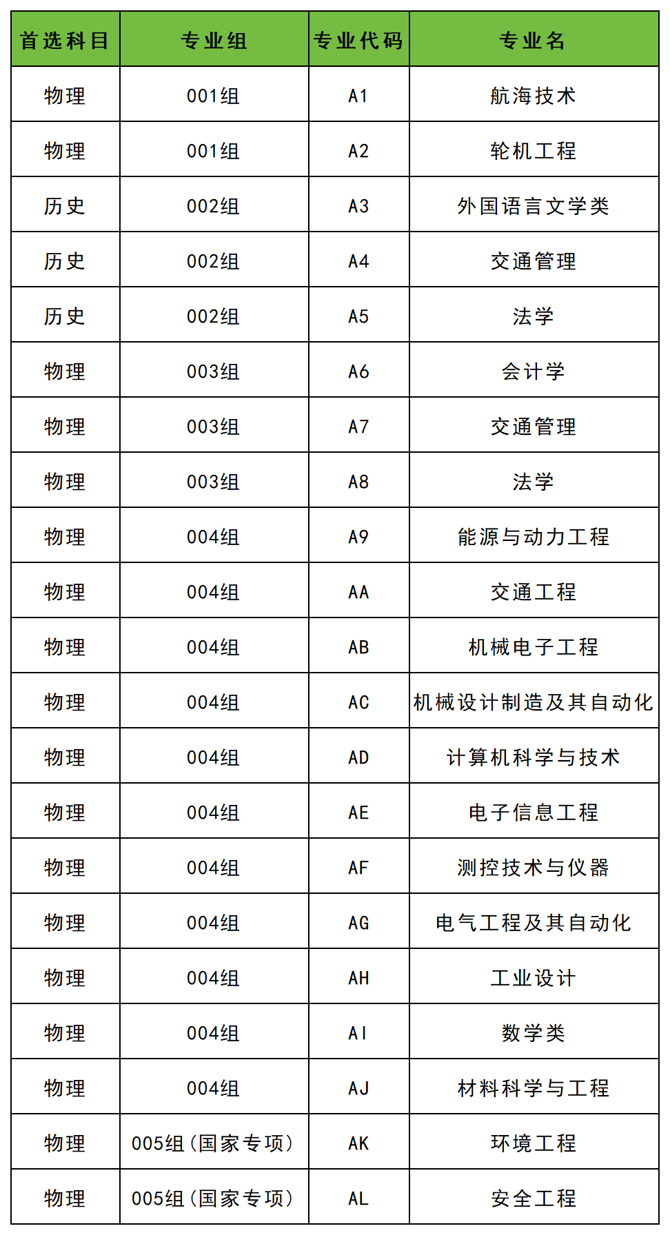 全國各大學(xué)在甘肅招生的專業(yè)代碼各不相同,一般而言,專業(yè)代碼為2位數(shù),同一專業(yè)不同專業(yè)方向的代碼也會(huì)有差異。以上海海事大學(xué)為例,第004專業(yè)組能源與動(dòng)力工程專業(yè)代碼是A9、交通工程專業(yè)代碼是AA、機(jī)械電子工程專業(yè)代碼是AB等。