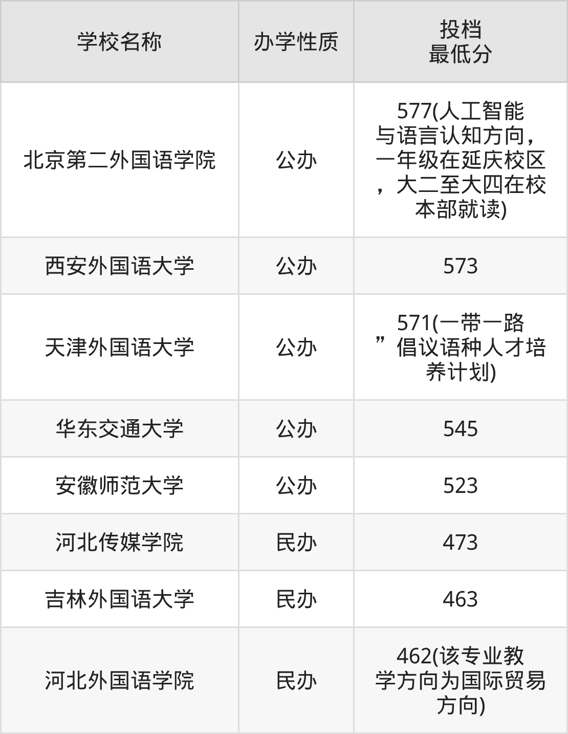 另外分數(shù)線比較低的大學還有吉林外國語大學(463分)、河北傳媒學院(473分)等。