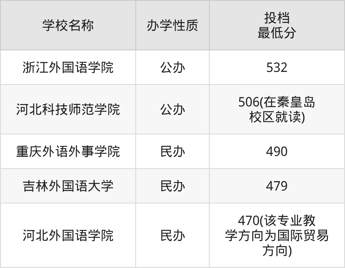 分?jǐn)?shù)線第五名是:河北外國(guó)語學(xué)院(該專業(yè)教學(xué)方向?yàn)閲?guó)際貿(mào)易方向),470分。