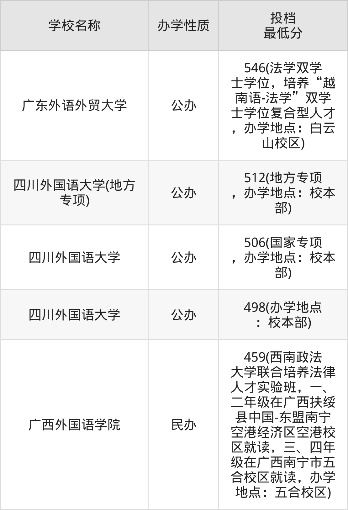分數(shù)線第一名是:廣東外語外貿大學(法學雙學士學位,培養(yǎng)“越南語-法學”雙學士學位復合型人才,辦學地點:白云山校區(qū)),546分。